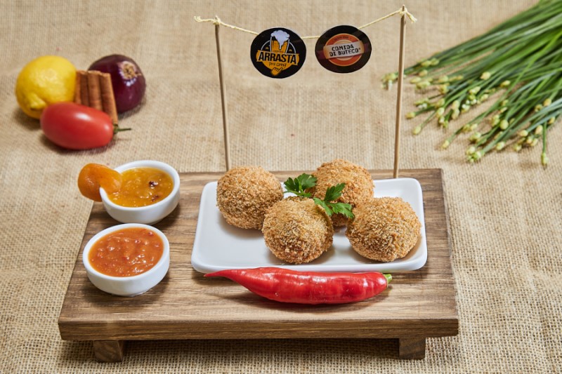 Petisco participante: Engajado - Bolinho de costela no bafo e catupiry recheado de queijo canastra meia cura, acompanhado duas geleias: pimenta defumada e damasco com bacon.
