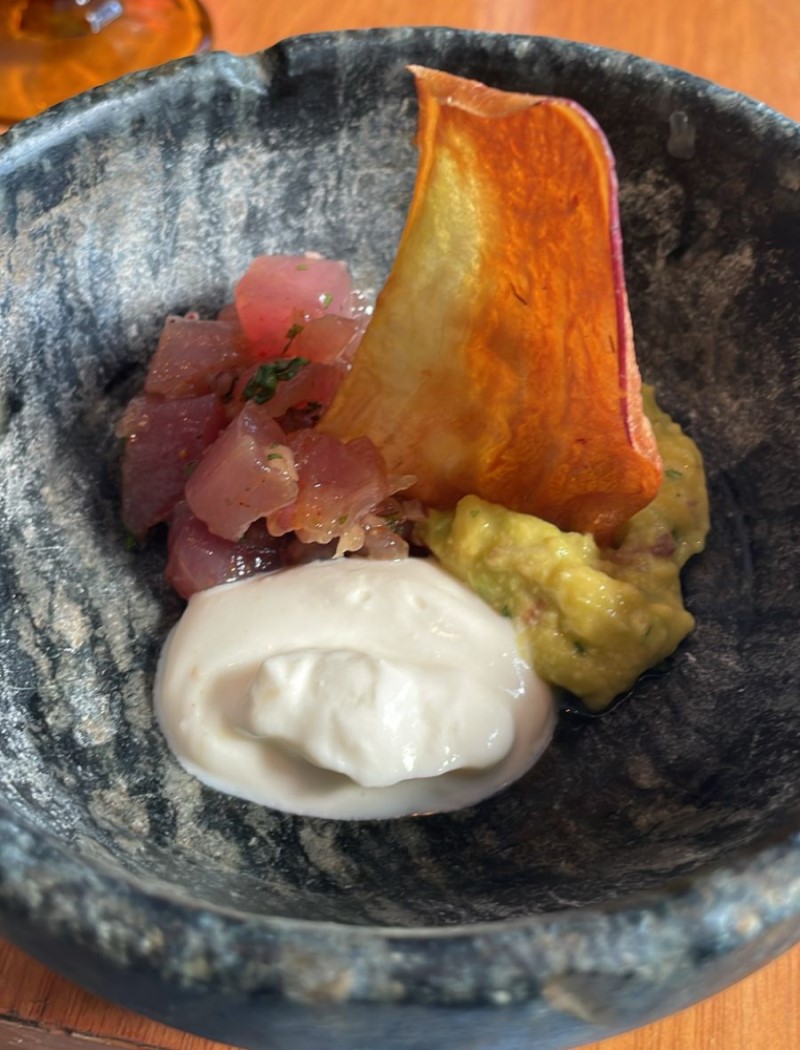 Relembrando o mix de outras culinárias e inovação que a chef Ana Zambelli destaca na formulação das novas combinações, o Tartar de Atum com Guacamole, Sour Cream e Chips de Batata Doce trouxe o México à mente, com uma mistura balanceada entre o azedo, cremoso, o frescor do peixe e a crocância da batata.