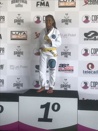 Ana Carolina, moradora do Morro do Banco e frequentadora do Projeto Denode, organizado pela 5ª Companhia de Inspeção de Área do 31º BPM, conquistou a medalha de ouro na Copa Kyra Graice de Ju-Jitsu.