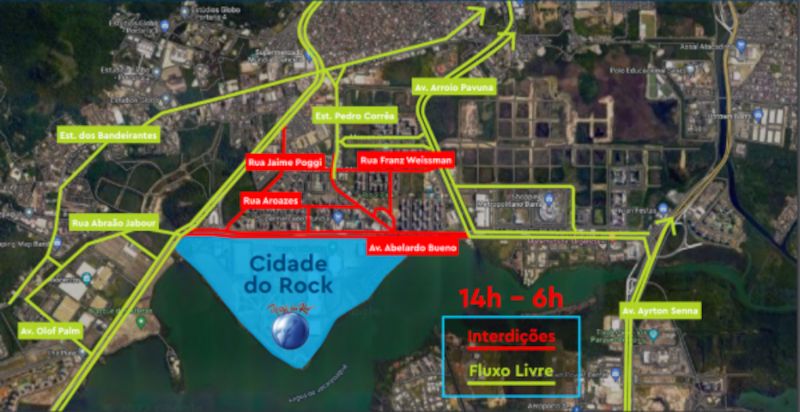 Nos pontos de bloqueio, apenas moradores credenciados poderão passar. Diversas interdições no transito estão programadas no perímetro do Parque Olímpico, em todos os dias do evento. Um exemplo é a interdição da Avenida Abelardo Bueno, no trecho entre a Estrada Arroio Pavuna e Avenida Salvador Allende, entre Às 14h e 6h.