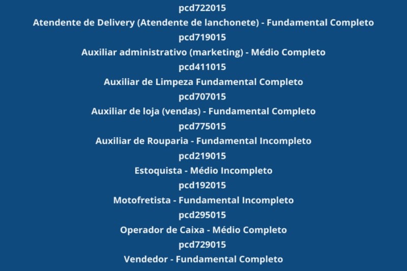 Veja abaixo a lista completa de vagas abertas na semana e seus códigos. As vagas para pessoas com deficiência têm códigos abertos por “pcd”: