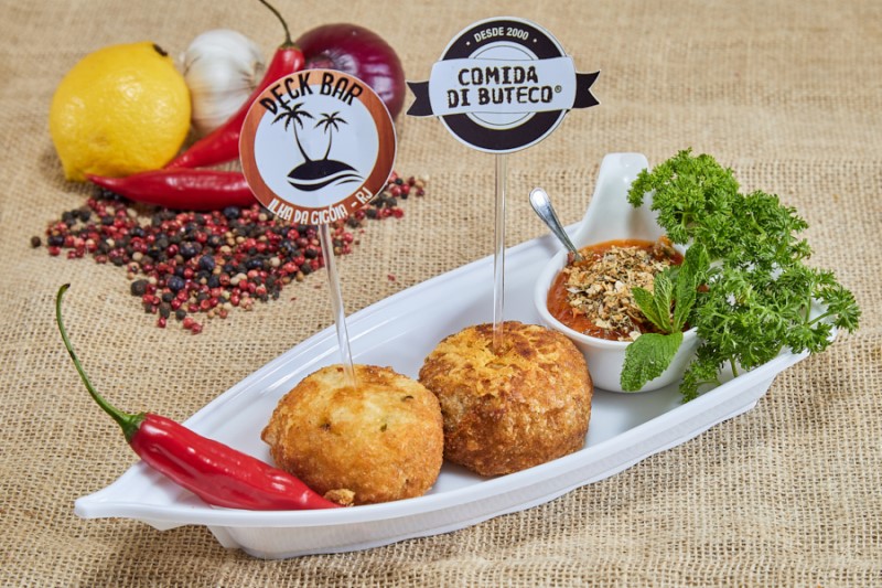 Petisco participante: Engajado - Bolinho de costela no bafo e catupiry recheado de queijo canastra meia cura, acompanhado duas geleias: pimenta defumada e damasco com bacon.