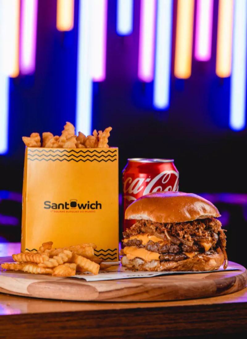 No cardápio do novo espaço, está o Santowich Burger (a partir de R$35), que é composto de pão square com 125g de burger angus fresco, coberto por american cheese, alface, tomate, cebola roxa, picles e maionese de cebolinha artesanal. O Bacon Square (a partir de R$37) também é um destaque, feito de pão square com burger angus fresco de 125g, coberto por american cheese, bacon grelhado e caramelizado e maionese de cebolinha.
