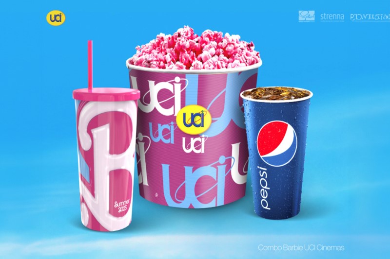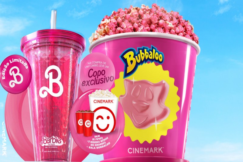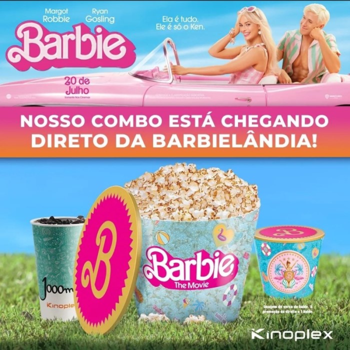 O combo da UCI, que está presente no shopping New York, na Barra da Tijuca, é composto de um balde genérico, com a pipoca pink, e uma bebida. De brinde, os clientes ganham um copo exclusivo do filme, com o “B” rosa em destaque (entre R$70 e 75,00). Semelhantemente, a rede Cinemark, do Shopping Downtown, propôs um combo com pipoca (pink também), duas bebidas e um pacote de balas, onde é oferecido um copo de brinde, desta vez, todo rosa e brilhante, com o “B” em letras brancas e destacado (entre R$78 e 92,00).