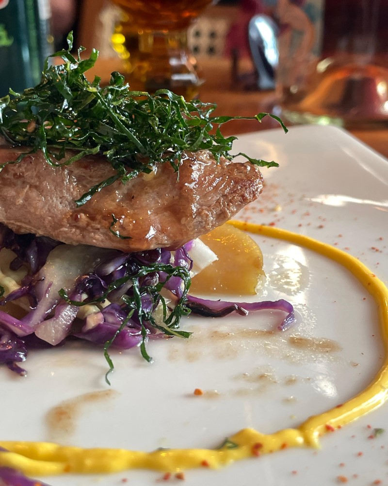Pato Grelhado com Maçã cozida no Missô Doce, Creme de Tamarindo, Kimchi da casa e Crispy de Couve. (Foto: Déborah Gama)