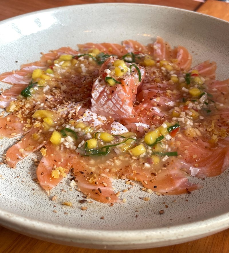 Carpaccio de Barriga de Salmão com Creme de Maracujá e Manga. (Foto: Déborah Gama)