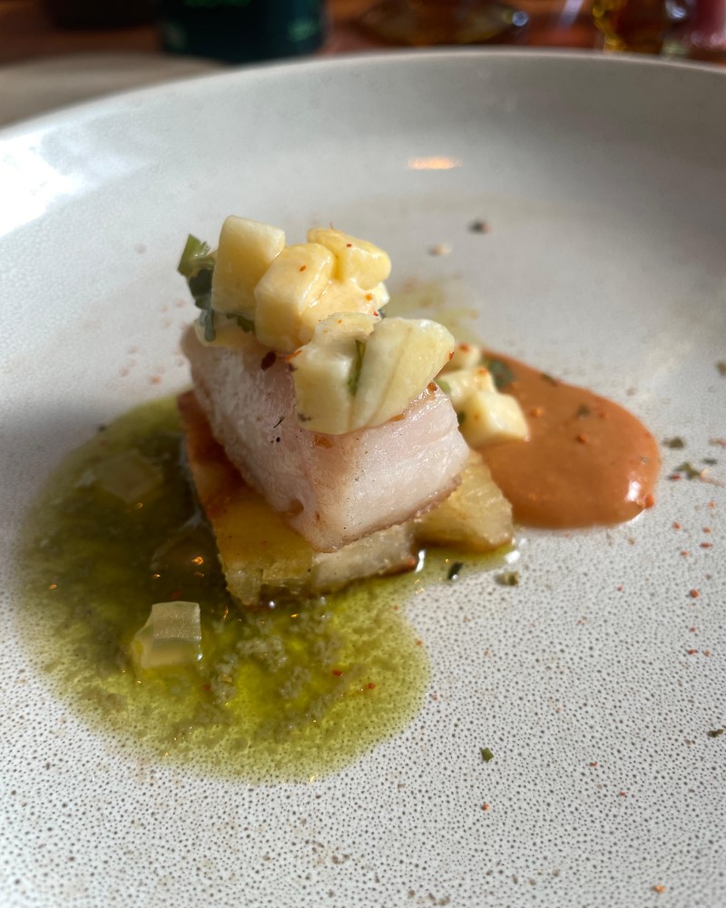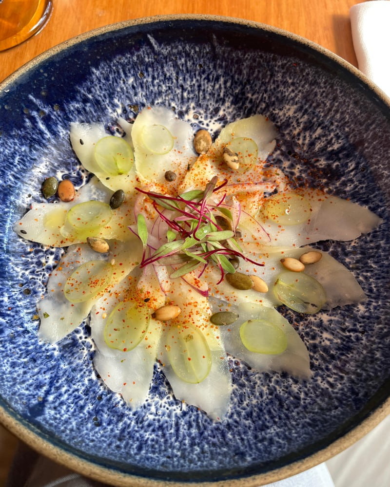 Outro prato que surpreendeu foi o Ceviche de Peixe Branco com Molho de Melancia e Crispy de Beterraba, uma explosão de sabores que equilibra perfeitamente as notas ácidas e adocicadas, fora a maciez de um peixe fresco e saboroso. Uma surpresa interessante foi o Dourado com Lâminas de Uva Verde, Cebola Roxa, Semente de Abóboras e Azeite Trufado, onde a crocância das sementes combina com o azeite, que devolve o sabor ao peixe.