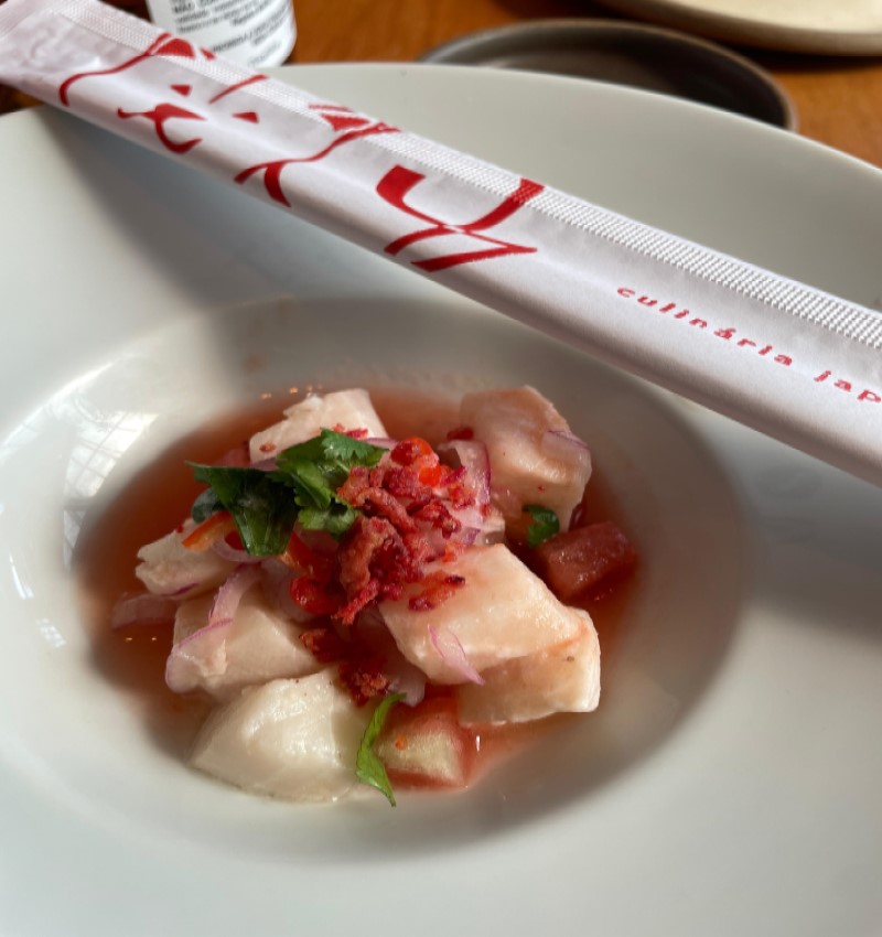 Ceviche de Peixe Branco com Molho de Melancia e Crispy de Beterraba. (Foto: Déborah Gama)