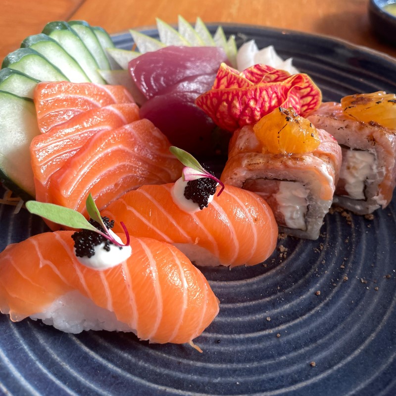 Duas boas opções para dividir com os amigos são o Carpaccio de Barriga de Salmão com Creme de Maracujá e Manga, onde as duas frutas entram em equilíbrio e trazem sabor ao peixe que, sem a presença dos dois ingredientes, talvez não fosse tão saboroso, mesmo com o frescor característico da casa; e o Combinado com Sushi com Maionese da casa e Ovas Black, Uramaki de Salmão com Cream Cheese e Tangerina Maçaricada, e Sashimis de Atum, Salmão e Peixe Branco, que é uma escolha certeira para os amantes da comida japonesa.