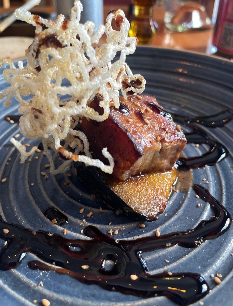 Barriga Suína com Missô, Abóbora Japonesa Gratinada e Crocante de Arroz Temperado. (Foto: Déborah Gama)