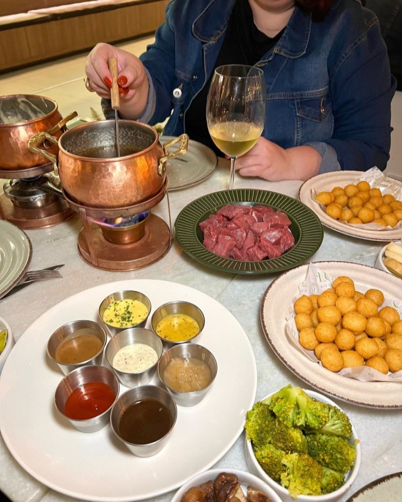 O local apresenta variedade de fondues salgados, com opções de carnes, queijos, molhos e legumes. (Foto: Reprodução/Instagram @loirebistro)