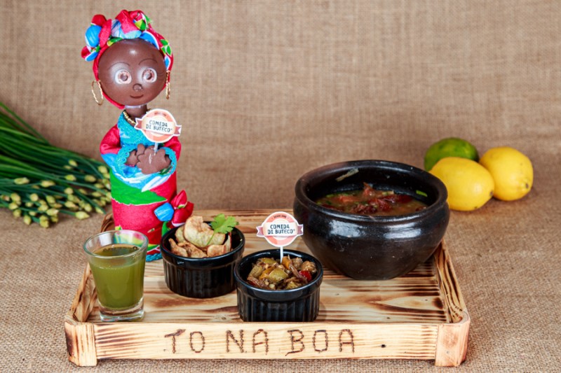Inspirado nas tradições culinárias do povo quilombola, o restaurante Tô na Boa apresenta um prato que celebra a resistência e a resiliência, o “Fé no Boteco”, um delicioso ensopado de banana verde, preparado com técnicas tradicionais e ingredientes frescos da própria comunidade. A banana é marinada em vinagre e depois misturada com carne seca, costelinha e bacon, para serem cozidos em um caldo aromático feito com ervas medicinais cultivadas no quilombo.