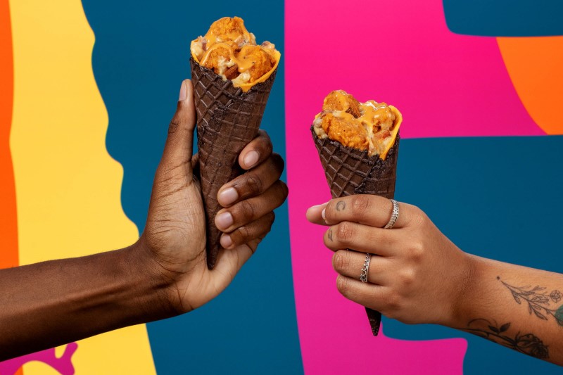 Entre os queridinhos da casa está o Chicken Cone Waffle, que une chocolate e frango. Um cone de chocolate crocante, recheado com um delicioso creme de frango, queijo e bacon, finalizado com pops de frango empanados envoltos no molho Sriracha Aioli (R$24,90).