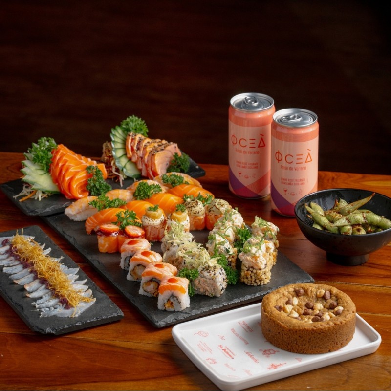 Combo especial inclui entrada, combinado de 40 peças, vinho Oceà Rosé e sobremesa da Sin Patisserie