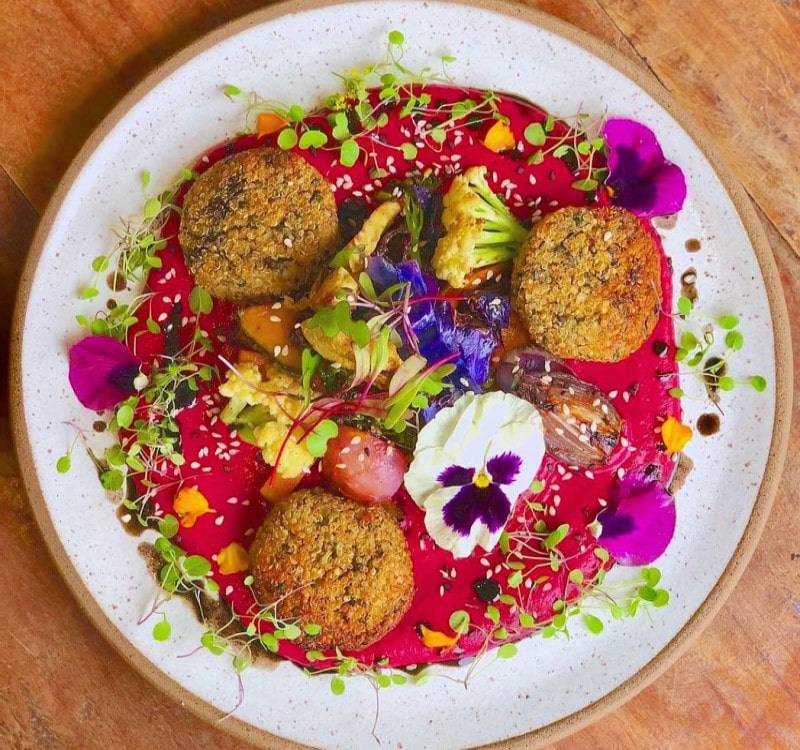 Bolinho de quinoa com hortelã e siciliano, com vegetais assados no creme de castanhas com beterraba, curry e gengibre, com óleo negro e sementes. (Foto: Divulgação)
