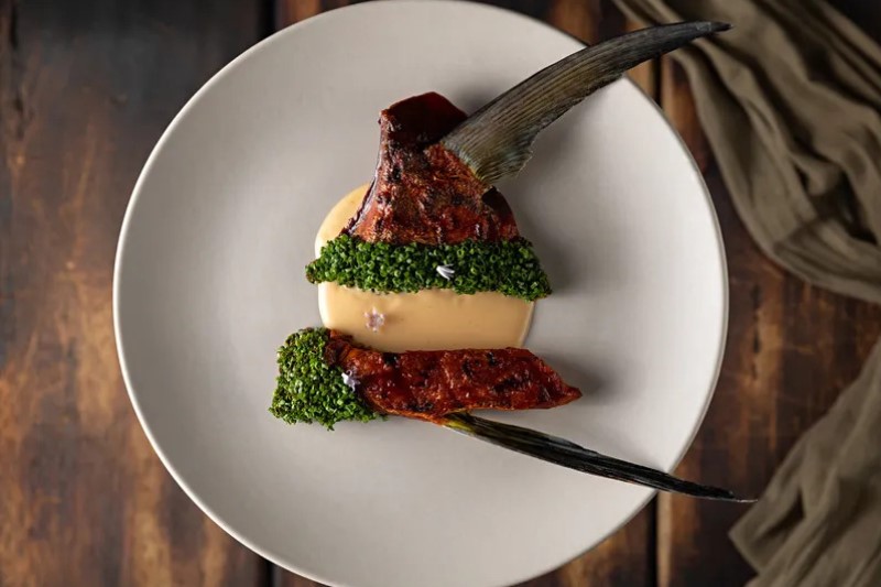 Colar de peixe maturado, caramelo picante e molho cremoso de vinho branco com sriracha e toque de shoyu. (Foto: Divulgação)