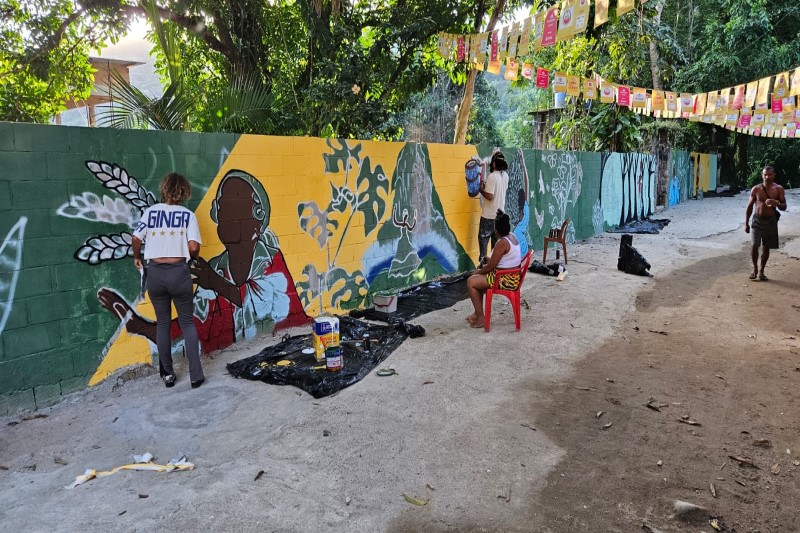 Grafite ‘Zona Oeste Profunda', contemplado pela Lei Paulo Gustavo, traz benzedeiras, tropeiros, bananeiros e até sacis, personagens importantes na História do Cafundá Astrogilda, quilombo no Parque Estadual da Pedra Branca. Dia de festejos também terá barracas com artesanato local, oficina de ervas e procissão, além de contação de Histórias ancestrais