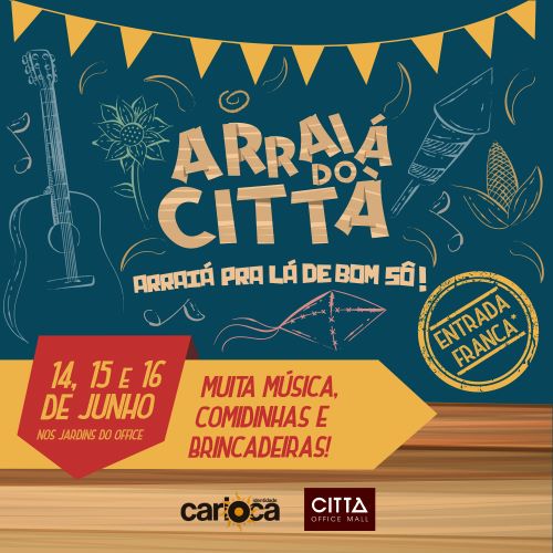 A Barra da Tijuca recebe neste final de semana, entre os dias 14, 15 e 16 de junho, o ‘Arraiá do Cittá, Pra Lá de Bom, Sô!’, no shopping Cittá Office Mall, que fica na Av. das Américas, 700. Com entrada gratuita, o evento promete uma comemoração típica, com músicas, brincadeiras, prêmios, comidas, bebidas da roça, danças e quadrilha.