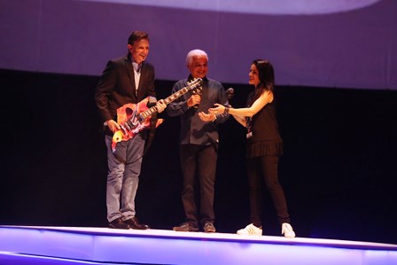 Prefeito Marcelo Crivella recebeu uma guitarra símbolo do festival das mãos de Roberto Medina durante o evento