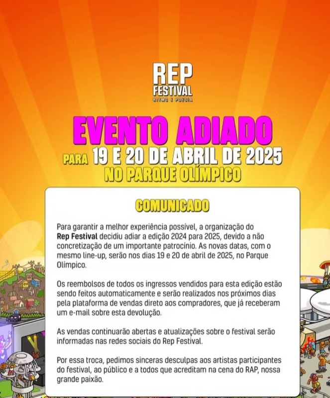 "Para garantir a melhor experiência possível, a organização do Rep Festival decidiu adiar a edição 2025 para 2025, devido a não concretização de um importante patrocínio", informa o posicionamento oficial divulgado.