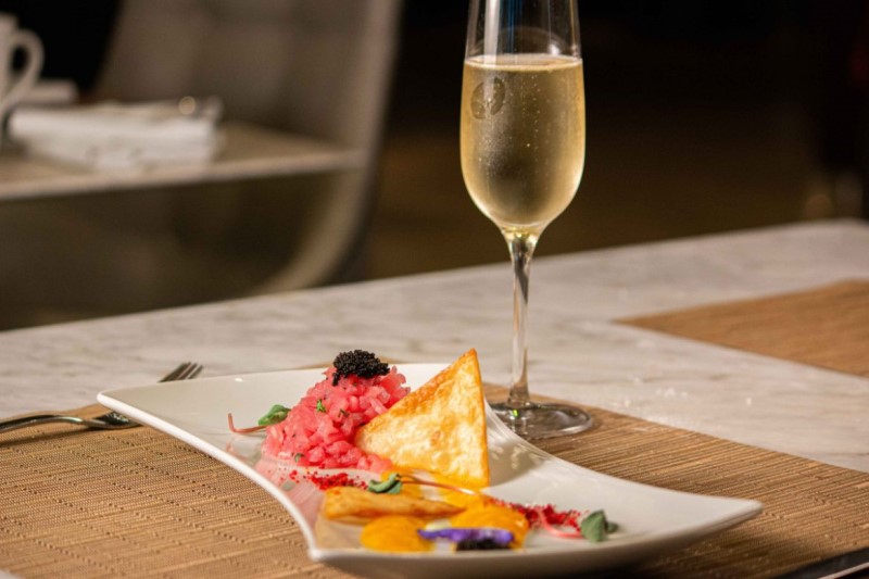 A primeira etapa do menu é composta de atum servido com coulis de manga e pérolas de shoyu. (Foto: Divulgação)