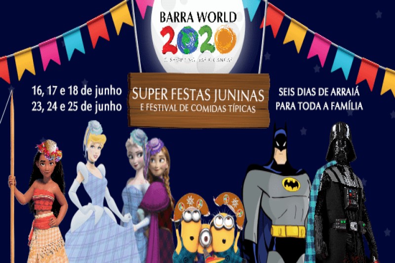 Durante este final de semana e no próximo, o shopping Barra World promove a “Super Festas Juninas”. Em seis dias de arraiás, será possível se divertir com muitas brincadeiras típicas, quadrilhas, desfiles, banda e a presença ilustre dos personagens mais amados entre as crianças, como Branca de Neve, Toy Story, Minions, Frozen, Batman, Moana e muitos outros. As festas acontecem nos dias 16, 17, 18, 23, 24 e 25 de junho.