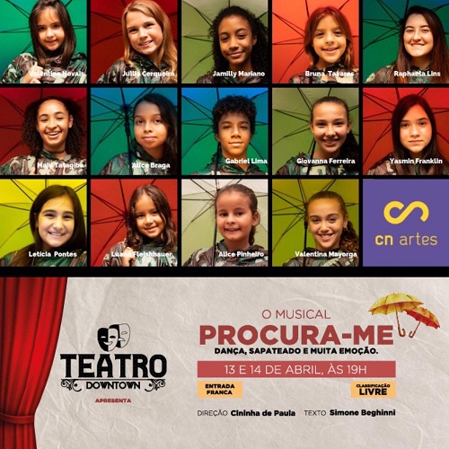 Um novo musical vai agitar o Downtown neste final de semana. A montagem especial de Páscoa terá duas apresentações gratuitas abertas ao público no sábado (13) e domingo (14;, às 19 horas, no palco montado em frente à Praça de Alimentação. O espetáculo “Procura-me” conta a história de crianças e jovens que de uma hora para a outra ficam sozinhos. Os adultos desaparecem de repente e todos acabam abrigados numa casa à beira mar sem saber o que aconteceu.