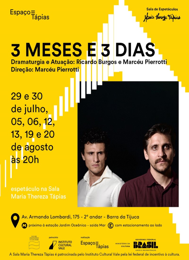 Com dramaturgia de Ricardo Burgos e direção de Marcéu Pierrotti, “3 Meses e 3 Dias” aborda questões como fragilidade masculina e paternidade. O enredo também traz uma narrativa profunda e delicada de assuntos dificilmente discutidos na sociedade moderna, mas que devem ser tratados com atenção.