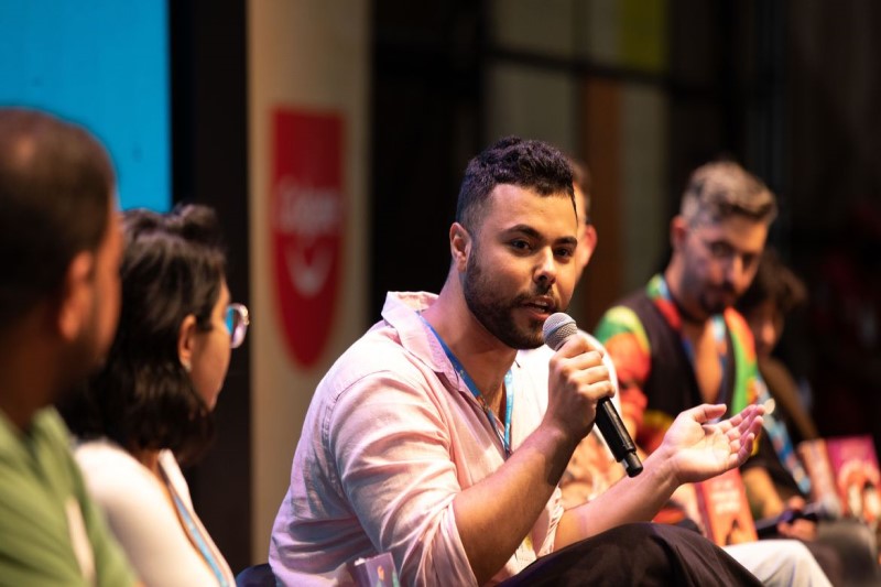 Juan Jullian: Então, eu tô muito animado pra essa mesa, porque eu acho que ela é bem sintomática do tempo que a gente tá vivendo. Até pouco tempo atrás, a gente tinha pouquíssimos livros com protagonismo LGBTQIA+, protagonismo não-branco, escrito por autores LGBTQIA+, escrito por autores não-brancos no catálogo das grandes editoras e nas livrarias. E acho que isso era refletido nos grandes eventos literários, porque a gente sempre se via sendo convidado para falar sobre os mesmos temas. No caso, pautas como é ser um autor LGBT, as dificuldades de ser um autor LGBT no Brasil, o que é muito importante, o que tem seu papel, mas é muito feliz quando a gente também tem a oportunidade de falar de outros temas. E a curadoria deste ano na Bienal foi muito feliz fazendo isso, porque eu acho que se você dá uma passada por todas as mesas, por todos os debates, você vai encontrar autores de diferentes lugares, com diferentes backgrounds, diferentes identidades de gêneros, orientação sexual. Então tá numa mesa extremamente diversa com outros autores LGBTQIA+, e não necessariamente falando sobre como é ser um autor LGBTQIA+, é muito animador pra mim. Até porque eu me vejo neste momento na minha carreira literária, né, quando a gente pensa em livro jovem adulto e livro jovem adulto nacional com protagonismo LGBT, a gente automaticamente pensa em romance. E o Viralizou, meu último livro, que é, enfim, sobre uma funkeira tentando sobreviver ao apocalipse zumbi no Rio de Janeiro, apesar dele ter um protagonismo LGBT, um protagonismo preto, é uma história de terror, uma mistura de terror com comédia. Então tá em uma mesa pra poder falar sobre histórias pro público jovem adulto pra lá. Além do romance, me deixa bem empolgado. Sem falar que a constituição da mesa é incrível, né? A gente tem o Ransom Riggs, que é um autor que eu amo, de O lar da srta. Peregrine para crianças peculiares. A gente também tem a Maria Freitas, que é uma grande amiga, então compartilhar a mesa ali com ela também é bem especial, a Lavínia. As expectativas estão gigantescas, estou bem animado.