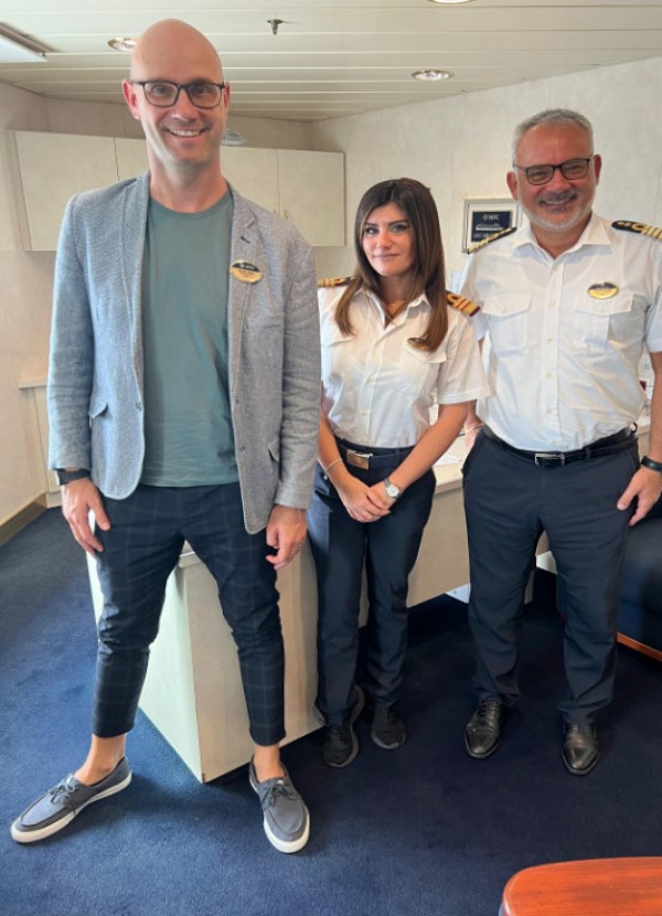 O diretor de cruzeiros Rafael Freire, a diretora de hotelaria Manuela Carusio e o comandante Carmine Siviero. (Foto: Cláudio Magnavita)