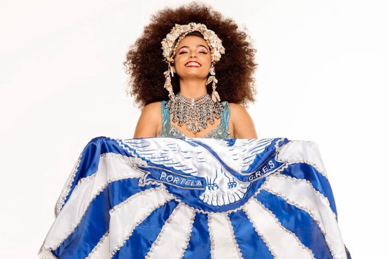 Emanuelle Araújo como Clara Nunes com bandeira da Portela. (Foto: Reprodução/Instagram)