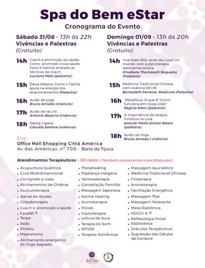 Em sua terceira edição no shopping Città, o evento se trata do único encontro holístico de peso da Barra da Tijuca envolvendo mais de 50 terapeutas que estarão atendendo com preço popular com preços a partir de R$ 50. Haverá também aulões de yoga, tai chi, dança cigana, palestras gratuitas e muito mais.