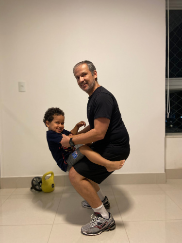 O fisioterapeuta criou uma sequência simples, com alguns exercícios básicos, como o agachamento e a prancha, que colocam o corpo em movimento. Para demonstrá-los, ele convidou um aluno, Marcelo Linhares, e seu filho Gabriel Fernandes, para axulia-lo.