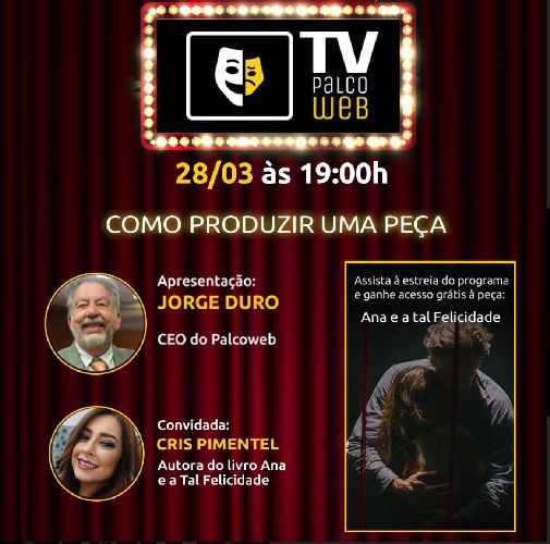 Na próxima segunda-feira (28/3), a plataforma de teatro online Palco Web realizará mais uma live. Desta vez, o tema será Como Produzir uma Peça. A apresentação será do CEO da plataforma, Jorge Duro e a convidada especial será Cris Pimentel, autora do livro "Ana e a Tal Felicidade". A transmissão, ao vivo, começa às 19h, no link https://palcoweb.com.br/#/canalpw. Quem assistir à live ganhará um voucher para conferir gratuitamente a peça online “Ana e a Tal Felicidade”, baseada no livro de Cris.