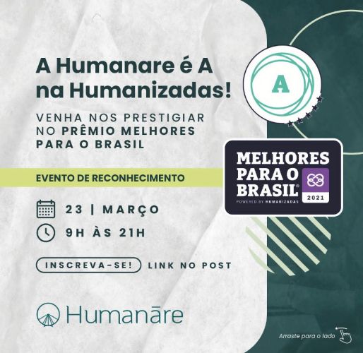 No próximo dia 23/3, a empresa Humanare, consultoria que atua na curadoria de experiências, métodos e conteúdos voltados para o desenvolvimento humano, organizacional e negócios de impacto, será uma das homenageadas no Prêmio Melhores para o Brasil - Humanizadas 2022. A cerimônia será online.