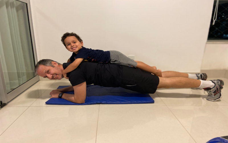 Numa homenagem ao Dia dos Pais, um aluno do Estúdio Vértico realiza os movimentos junto com o filho