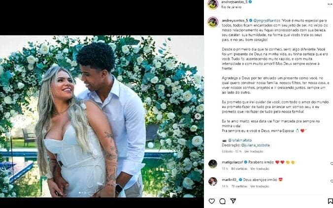 Nas redes sociais, o casal compartilhou fotos e trocou juras de amor.No Instagram, Yngryd Freire alterou seu perfil, assumindo o sobrenome Santos, que vem do volante vascaíno, recentemente vendido para o Chelsea. Andrey permanece no clube carioca até 30 de junho.