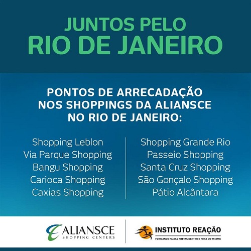 A Aliansce Shopping Centers, em parceria com o Instituto Reação, promove uma campanha para ajudar as vítimas das fortes chuvas que atingiram o Rio de Janeiro nesta semana. O Via Parque e outros nove shoppings da rede estão recolhendo alimentos não perecíveis, água potável, roupas, produtos de higiene e limpeza. As doações devem ser entregues até domingo (14), no SAC durante o horário de funcionamento do shopping.