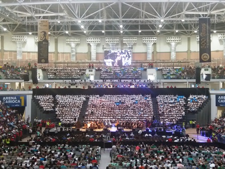 Fiéis lotam a Arena Carioca 1, no Parque Olímpico, para uma grande celebração