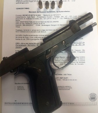 A Delegacia de Atendimento a Mulher de Jacarepaguá (DEAM) realizou buscas na casa de Naldo, encontrando uma pistola calibre 7,65 sem registro e munição. Ele foi autuado em flagrante e levado à delegacia.