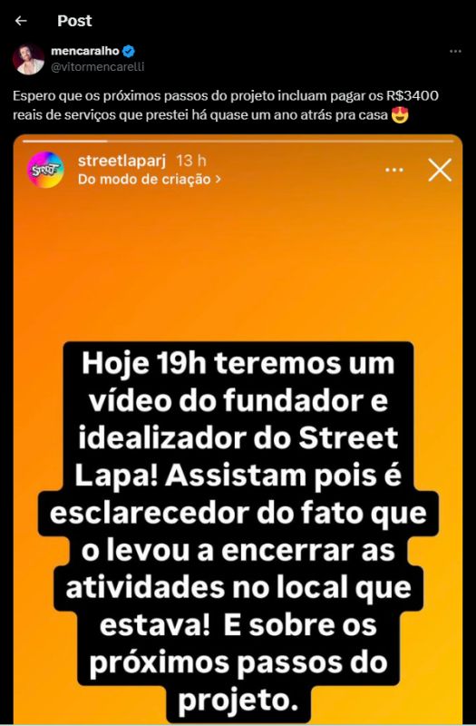 Além de Mencarelli, Facury, Mello e Luk, outros profissionais também aguardam o pagamento de cachês e salários que Jorge Nascimento deve a eles. As denúncias seguem se acumulando, com artistas reforçando os relatos de descaso financeiro por parte da Street Lapa. A boate, que recentemente anunciou o encerramento de suas atividades no local onde funcionava, ainda não se pronunciou oficialmente sobre as acusações e os próximos passos.