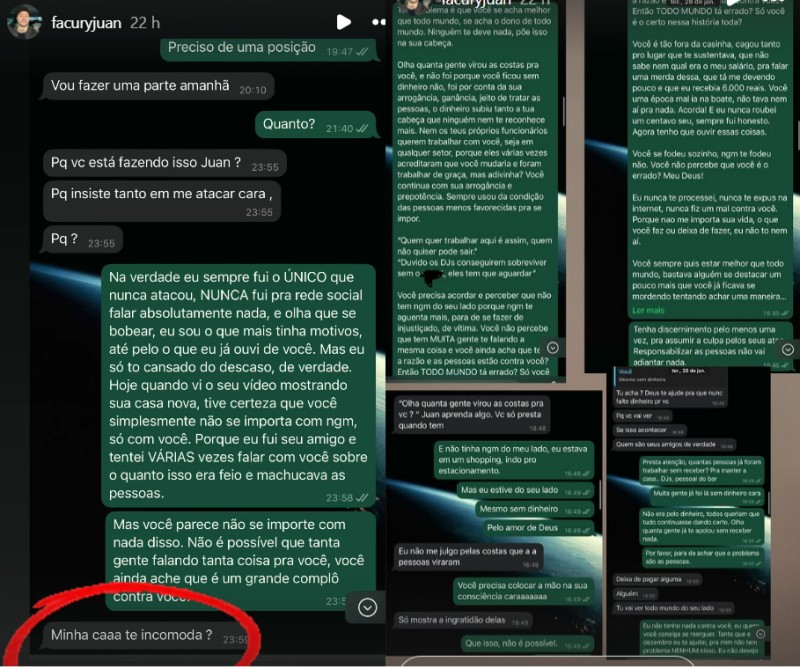 Outro profissional da cena, Juan Facury, também utilizou suas redes sociais para cobrar Jorge Nascimento e revelou conversas privadas com o empresário. No print divulgado, Facury insiste na necessidade de uma resposta sobre o pagamento devido. Em resposta, Jorge questiona: “Minha casa te incomoda?”. O produtor de eventos rebate afirmando que sempre foi um dos poucos que nunca atacaram Jorge publicamente, mas que a falta de consideração e os constantes atrasos levaram à exposição do problema.