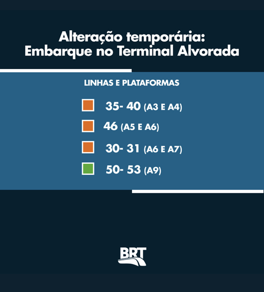 Por conta disso, o embarque e desembarque de passageiros está acontecendo somente na plataforma A. As linhas 35 e 40 estão nas áreas A3 e A4; a 46 na A5 e A6; 30-31 na A6 e A7; 50 e 53 na A9.