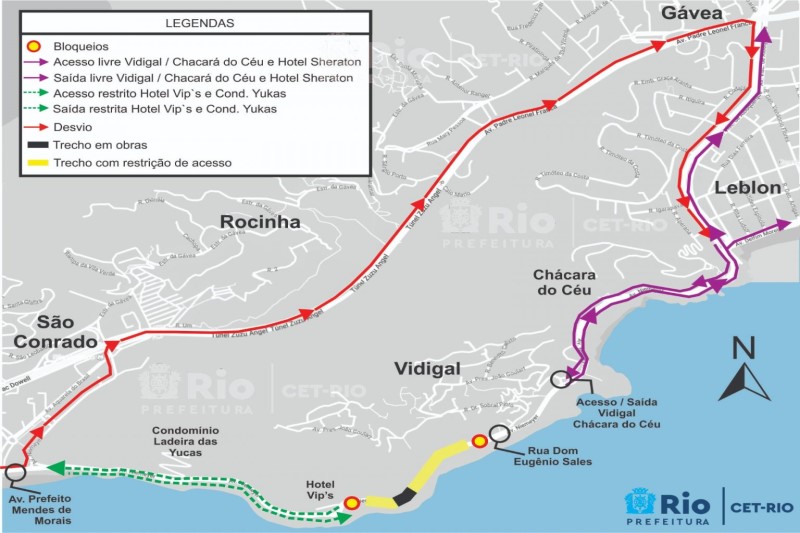 O acesso dos moradores do Condomínio Ladeira das Yucas e hóspedes do Hotel Vip´s será pelo lado do bairro de São Conrado, no entroncamento da subida, no início da interdição, em frente ao Hotel Nacional.
