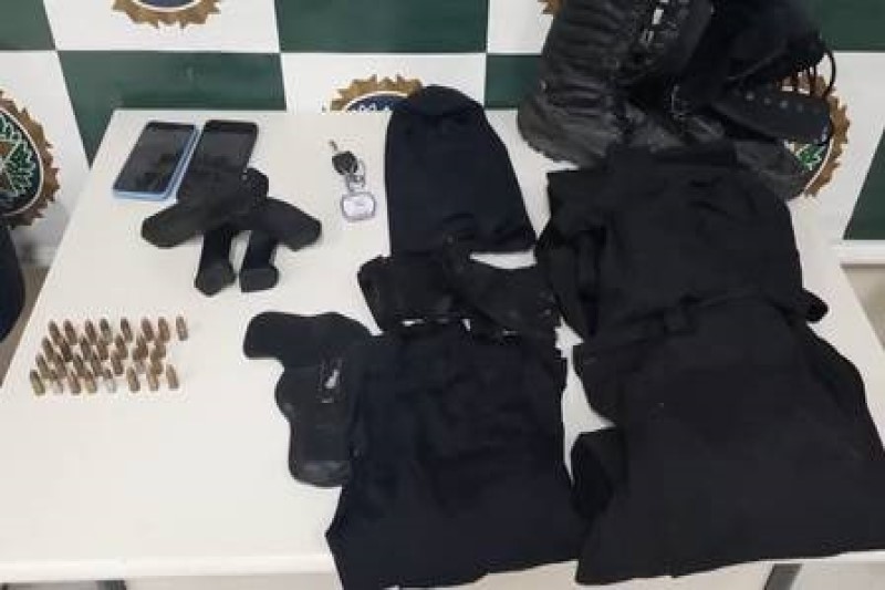 A dupla foi presa em flagrante por milícia privada, porte ilegal de arma de fogo, receptação e furto qualificado. Eles também tinham um mandado de prisão em aberto por roubo.