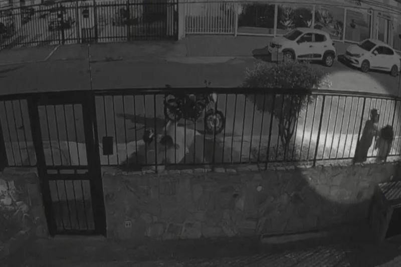 Uma das mulheres corre e se esconde atrás de um homem que passava pela calçada. Os bandidos desceram das motos, o agrediram e jogaram o pedestre no chão.