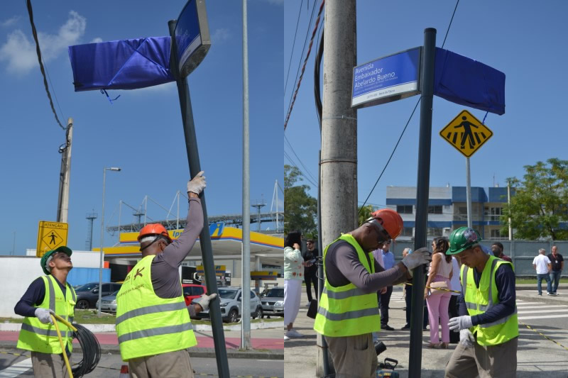 A placa em homenagem foi afixada em frente ao posto de gasolinas ao lado do Centro Aquático Maria Lenk.
