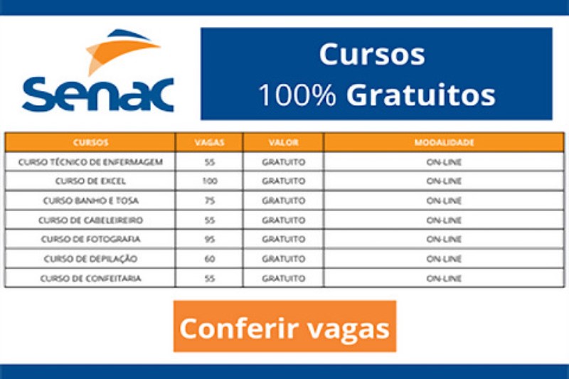 Além disso, a modalidade de ensino à distância é ofertada, também de forma gratuita, com opções de cursos técnicos de enfermagem, excel, banho e tosa, cabeleireiro, fotografia, depilação e confeitaria.