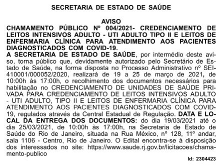 De acordo com Castro, os leitos ficarão na rede privada e serão pagos pelo Estado. "Estamos agindo contra o avanço da pandemia. Para que isso aconteça rapidamente, determinei publicação do Chamamento Público no DO de ontem para ampliar nossa rede e salvar vidas", informou no Tweet.