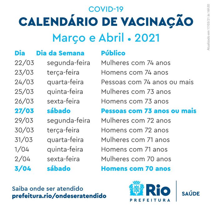 Na noite desta quinta-feira (18), o prefeito Eduardo Paes divulgou, através do seu perfil no Twitter, o calendário da vacinação contra a Covid-19 para pessoas com 70 anos ou mais.